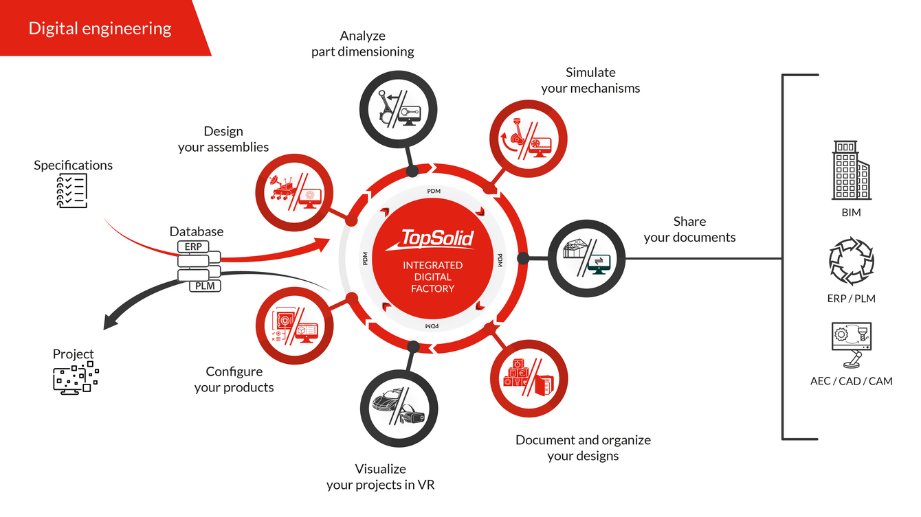 Die Bedürfnisse der mechanischen Industrie haben sich mit der Notwendigkeit der Wiederherstellung von 3D-Teilen, deren Konformität und dem zunehmenden Bedarf an Kommunikation mit der Werkstatt verändert. Aus all diesen Gründen ist TopSolid für die mechanische Zulieferindustrie unverzichtbar geworden.