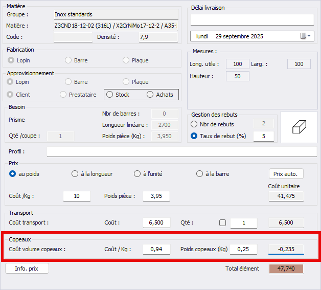 - Coût matière optimisé : Réduisez le coût global de la matière première en intégrant les revenus issus de la revente des copeaux.