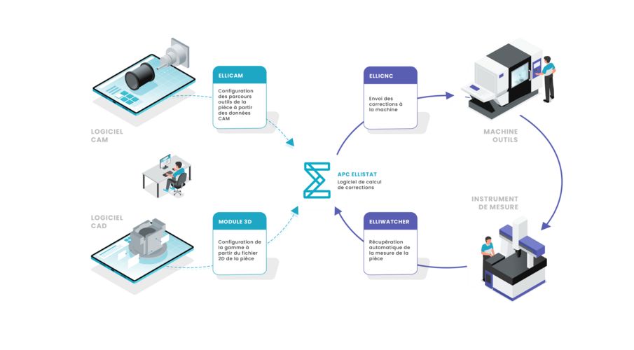 En tant que passerelle intelligente entre TopSolid'Cam et le module APC (Automated Process Control), Ellicam analyse en temps réel les modèles 3D et les parcours d'usinage afin de configurer automatiquement les outils. Toutes les données critiques sont capturées : dimensions, géométries, états de surface, codes d'usinage, etc.